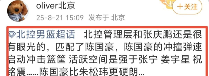 据知名体育博主“oliver北京”发博透露:“北控管理层和张庆鹏还是很有眼光的,匹配了陈国豪,陈国豪的冲撞、弹速启动、冲击篮筐、活跃空间是强于张宁、姜宇星和祝铭震的,陈国豪比朱松玮更硬朗…”