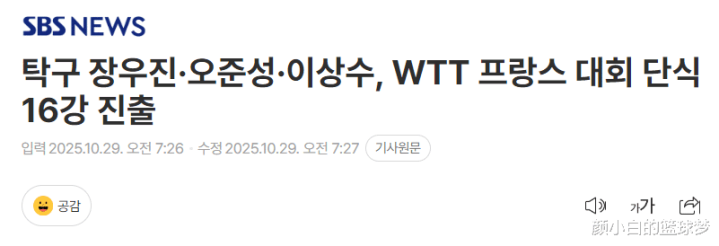 北京时间10月26日,韩国媒体《SBS NEWS》评价了这首个比赛日,他们总结了首个比赛日3胜2负,张禹珍、李尚洙、吴晙诚一同携手晋级男单16强。