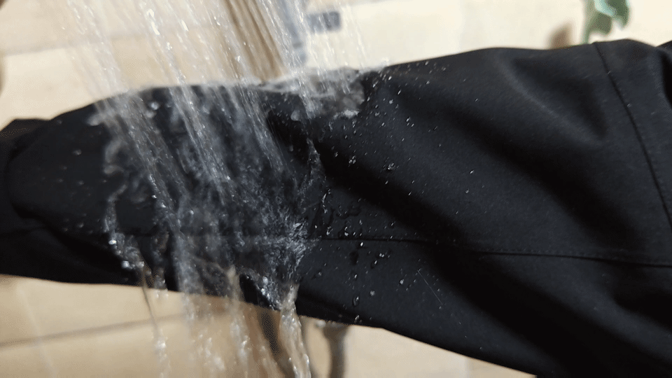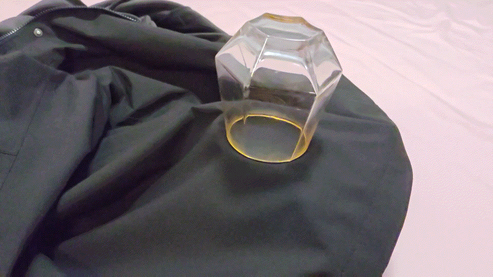 用花洒喷在袖子部分,然后抖去表层水珠,再用纸巾覆盖按压,会发现不一会纸巾浸湿,衣袖上恢复干燥,看下内部也是干燥状态。