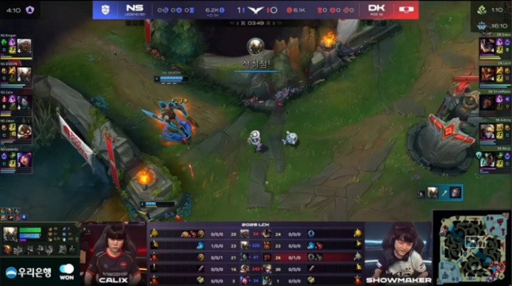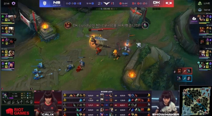 [6:01]Calix阿卡丽中路飞镖挂许哥,随后升到6级接大招在塔前单杀许秀,Lucid皇子随后来中收掉残血Calix,紧接着GIDEON来下gan,Siwoo兰博无处可跑被杀,NS打出1换2。