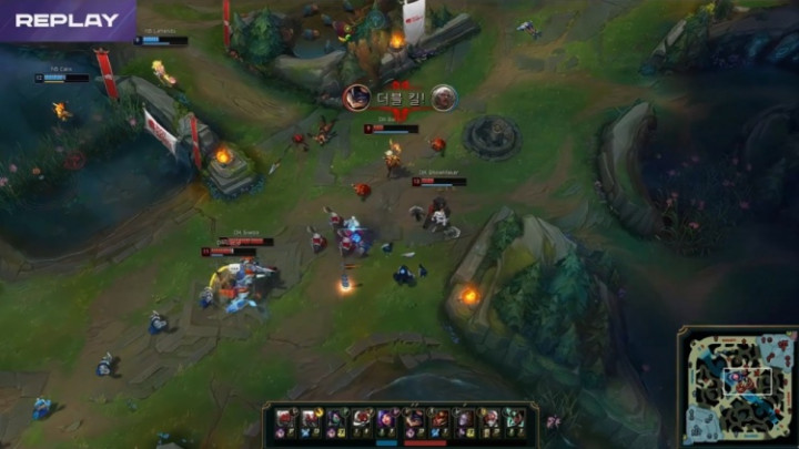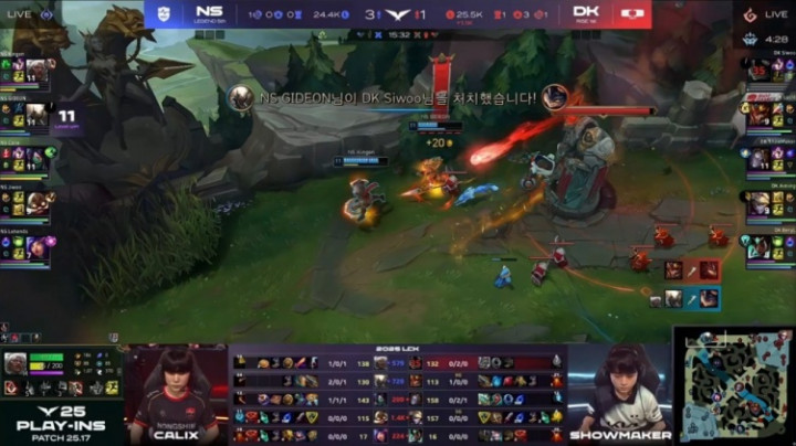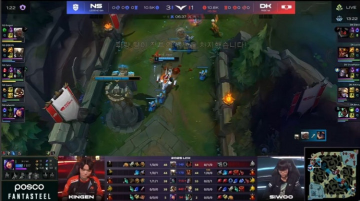 [18:09]NS中路放出先锋撞掉DK一塔,Lehends妮蔻推推棒开大击飞DK四人,但许哥发条反手开大拉NS四人,Siwoo兰博洒大瞬间双杀,DK打出1换3,经济差距不大。