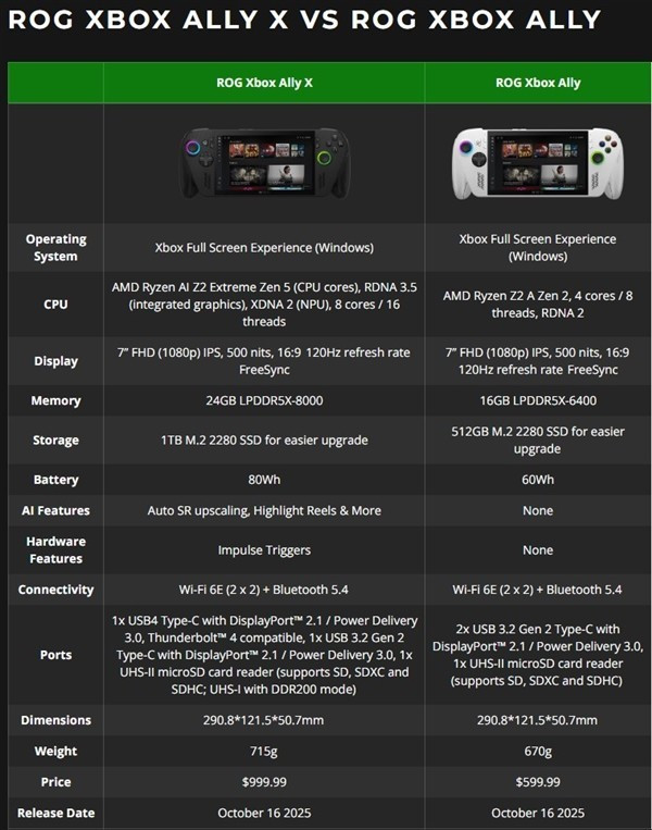微软XBOX掌机正式开售了,型号是微软与华硕联手打造的ROG Xbox Ally以及ROG Xbox Ally X,现在在北美地区开启预定,10月16号正式发售。白色Xbox Ally定价599美元,面向高端用户的黑色Xbox Ally X定价999美元,两者定价高于预期。