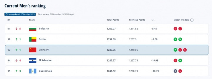 直播吧10月17日讯FIFA更新男足国家队排名,10月国家队比赛日没有集训的中国男足排名上升一位,从第94位升至第93位。