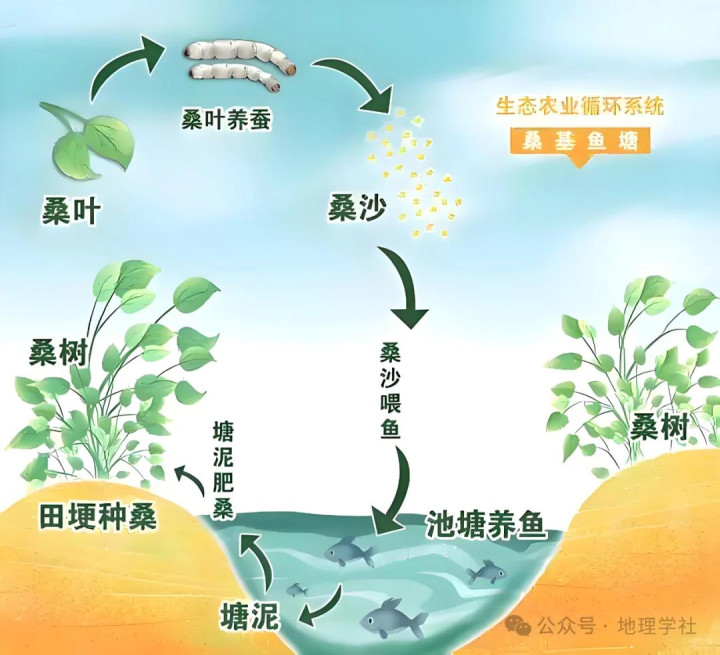 桑→蚕→鱼:桑叶养蚕,蚕沙喂鱼。 鱼→泥→桑:鱼塘底泥富含有机质,作为桑树肥料。 能量流动:太阳能通过桑树转化为生物能,再通过蚕和鱼的养殖实现多级利用,形成 “无废弃物、全循环” 的农业模式。