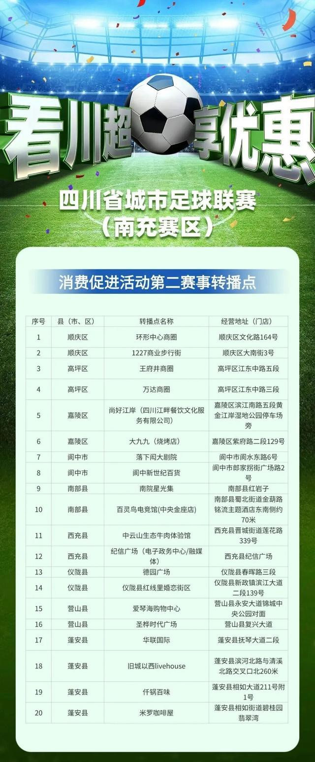 在顺庆环形中心、1227商圈、高坪王府井购物中心、高坪万达广场等10余个大型商场及商业网点设置第二观赛点,同步开启川超赛事直播,高清画面、实时音效让现场观赛感“拉满”!